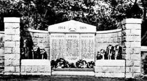 Von diesem Denkmal stehen noch die äußeren Konturen. Das Mittelteil mit den Inschriften, Namenstafeln und das EK-Zeichen wurden entfernt. Es dient heute als großer „Blumenkasten“.