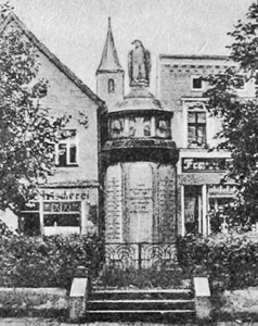 Denkmal für die Gefallenen des 1. Weltkriegs auf dem Marktplatz: Runde Stele mit Widmungs- und Namenstafeln, sowie EK-Zeichen und Stahlhelmen im oberen Teil, gekrönt von einem Adler (abgerissen).