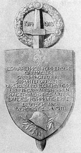 Tafel Gren.-Regt. 2: 1914-1918 ES WAREN 2581 POMMERSCHE GRENADIERE DABEI 82 OFFIZIERE 269 UNTEROFFIZIERE DIE STOLZ UND TODESMUTIG IHR LEBEN GABEN FÜR IHREN KAISER UND IHRES VATERLANDES RUHM UND EHRE DEUTSCHLAND VERGISST SIE NICHT!