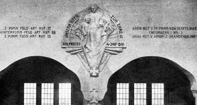 Gedenktafeln beiderseits des Altars, jeweils mit zentraler Widmung, flankiert von zwei Säulen mit krönenden EK-Zeichen und Adlerfiguren: Links für das Füsilier-Regiment Nr. 34 und das Feld-Artillerie-Regiment Nr. 38. Rechts für Grenadier-Regiment Nr. 2 und das Pionier-Bataillon Nr. 2.