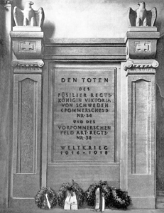 Gedenktafel F.R. 34 u. F.A.R. 38: DEN TOTEN DES FÜSILIER-REGTS. KÖNIGIN VIKTORIA VON SCHWEDEN (POMMERSCHES) NR.34 UND DES VORPOMMERSCHEN FELD-ART-REGTS NR. 38 WELTKRIEG 1914-1918