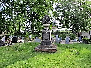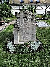Es steht auf dem Friedhof auf einem dreifachen Stufensockel ein quaderförmiges Steindenkmal; oben auf eine