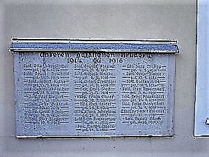 Kirchenwand eine weiße Steinplatte mit den Namen der Gefallenen des 1. Weltkrieges. Gleich gegenüber steht