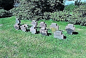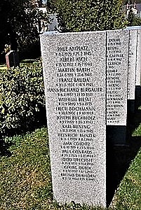 Auf dem Friedhof befindet sich eine Gräberanlage Zweiter Weltkrieg. Am Rand zweier Freiflächen stehen/liegen noch einundzwanzig z.T. verwitterte ca. 50 cm hohe Grabsteine aus rotem Sandstein. Daneben eine Gedenkplatte für italientische Soldaten. Am Rande der Flächen stehen insgesamt acht Stelen mit den Namen der hier Begrabenen. An der Wand der Friedhofshalle befindet sich eine große Metallplatte mit den Namen der Gefallenen des Ersten Weltkriegs aus Stollberg/Erz.