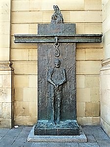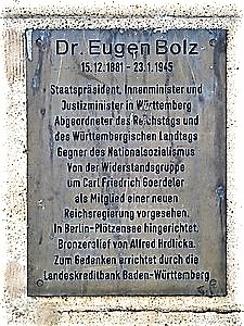 Stuttgart (Dr. Eugen Bolz), Baden-WürttembergPLZ 70173 Seitliche Fassade des Königsbaus zur Bolzstraße hin. 1993 von Alfred Hrdlicka geschaffenes Bronzedenkmal für Eugen Bolz. Auftraggeber war die Landeskreditbank, an deren Gründung der damalige württembergische Innenminister maßgeblich beteiligt war. Zum Denkmal gehörige bronzene Informationstafel.