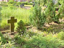 Friedhof: Privater Gedenkstein; Kriegsgräber für sechs tote Flieger (drei Holzkreuze mit je zwei Namen).