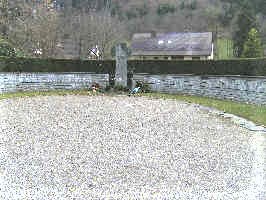 Im ehemaligen Stadtgraben hohes Steinkreuz, links und rechts angrenzend halbkreisförmige Steinmauer mit den Namen und Daten der Gefallenen.
