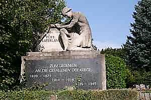 Auf einem Sarkophag ein kniender Krieger an einem Pult. Das Denkmal für den 1. Weltkrieg befand sich ursprünglich auf dem Steinberg. Inzwischen wurde es auf den Friedhof umgesetzt und den drei Kriegen gewidmet, wobei die Namen an der Vorderseite durch eine neuere Tafel verdeckt werden.