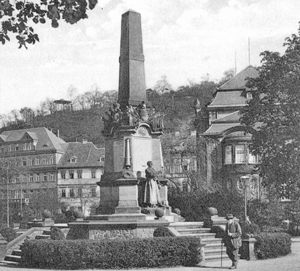 Denkmal für die Gefallenen des Krieges 1866: Plattform mit Treppenaufgängen, darauf ein reich verzierter abgestufter Obelisk mit Widmungs- und Namenstafeln im unteren Bereich, davor das Standbild eines Soldaten. Denkmal gekrönt von einem Doppeladler.