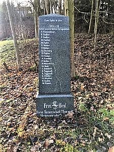 Tharandt (ehem. Sportplatz), Landkreis Sächsische Schweiz-Osterzgebirge, SachsenPLZ 01737 Das Denkmal steht auf dem ehemaligen Sportplatz an der Klippermühle in Tharandt. Aus der ursprünglichen Inschrift wurden die Worte "entsetzlichen Völkermorden" nach 1933 entfernt, wie das historische Bild zeigt.