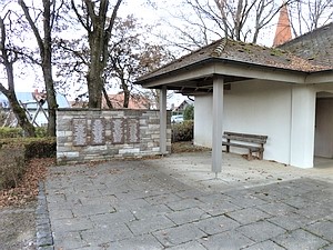 Friedhof. Schlichtes Kriegerdenkmal für die Gefallenen, Verstorbenen und Vermissten der beiden Weltkriege aus der Gemeinde, es besteht aus vier an einer gemauerten Wand befestigten Steintafeln.