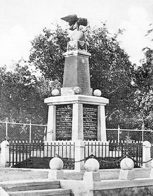 Denkmal für die Gefallenen des 1. Weltkriegs: Quader mit eingelassenen Namenstafeln und aufgesetztem Obelisken mit krönendem Adler (abgerissen).