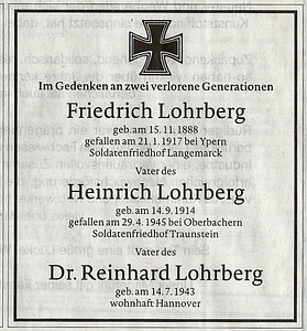 Im Gedenken an zwei verlorene Generationen (Name, Daten) gefallen (Daten) Soldatenfriedhof Langemarck. Vater des Heinrich Lohrberg.