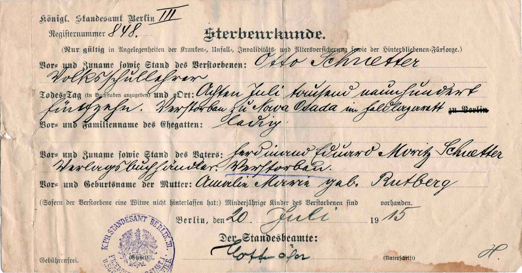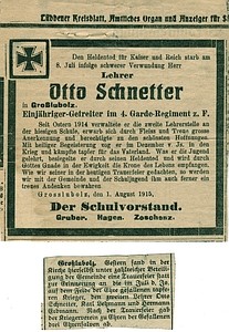 Volksschullehrer in Großbubolz, Kreis Luckau; verwundet am 01.07.1915 durch Schrapnellschuß. Sohn von Ferdinand Eduard Moritz Schnetter (verst.1909), Verlagsbuchhändler & Amalie Marie Schnetter, geb. Rutberg (verst.1924)