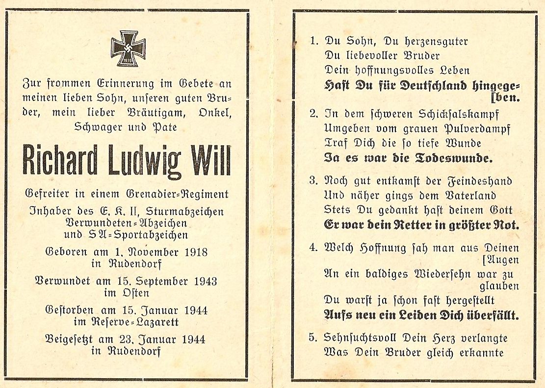 Inhaber d. EKII, Sturmabzeichen, VWA, SA Sportabzeichen. Beigesetzt in Rudendorf am 23.1.1944