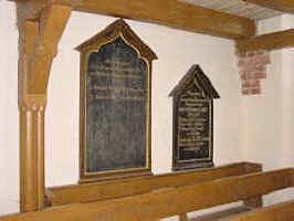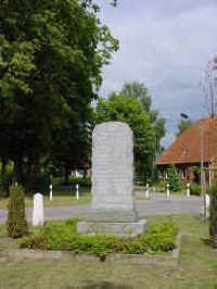 Holztafeln für die Kriege 1808-15 und 1870-71 in der Kirche von Uelitz (geweiht 1754). Granitplatte auf einem 2-stufigen Podest vor der Kirche für die Gefallenen der beiden Weltkriege.