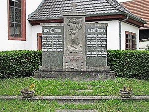 Das Denkmal steht auf einer kleinen Rasenfläche rechts vom Zugang zur Kirche St. Markus auf einem Stufensockel. Zwei Steinplatten mit den Namen der Gefallenen/Vermissten beider Weltkriege flankieren eine Platte, auf der sich das Relief des auferstandenen Jesus befindet. Mit der rechten Hand segnend und in der linken Hand eine Fahne haltend, wird er auf einer Wolke schwebend dargestellt. Den oberen Abschluss bildet ein Steinkreuz. Auf den beschrifteten Steinplatten liegt je eine leicht überstehende Platte, auf der jeweils eine Flammenschale befestigt ist. Die Namen sind eingraviert und weiß gefasst. Auf einem Sockel unter dem Mittelteil befindet sich das Relief eines Stahlhelmes, welcher von 2 Verzierungen (Portepees?) gesäumt wird.
