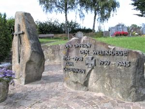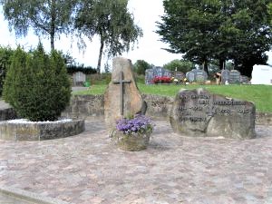 Uttrichshausen (Gemeindefriedhof), Gemeinde Kalbach, Landkreis Fulda, HessenPLZ 36148 Auf dem 1976 fertiggestellten Gemeindlichen Friedhof in Uttrichshausen nahe der Bundesautobahn A7 wurde 1984 die Segnung des neuen Ehren- und Mahnmals vorgenommen. Auf der schönen blumenbepflanzten Anlage stehen zwei Natursteine. Auf dem Felsbrocken der Leichenhalle zugewandten linken Seite befindet sich ein Kreuz. Auf dem rechten Stein befindet sich neben der Darstellung eines "Eisernen Kreuzes" eine Inschrift.