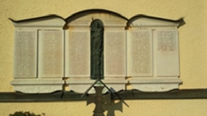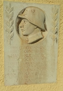 Relief am Kircheneingang rechts mit Figur in der Mitte, Eisernem Kreuz und beidseits die Namen. Einzelrelief an der Kirchenwand für Hans Buchberger. Dazu Daten von privaten Grabsteinen.