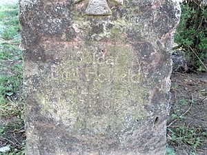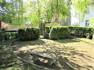 Vor dem Friedhof bzw. der Kirchenruine befindet sich die Gedenkstätte. Sie besteht aus einem Gedenkstein ohne Namen für Opfer des Zweiten Weltkriegs. Dahinter steht ein ca. 2 m hoher Stein mit dem Relief einer Trauernden. Im Halbkreis zu beiden Seiten stehen ca. 20 kleine Steine (ca. 50 cm hoch) mit den Namen der Gefallenen des Ersten Weltkriegs. Ein Teil der Steine ist komplett lesbar, die meisten aber teilweise verwittert.
