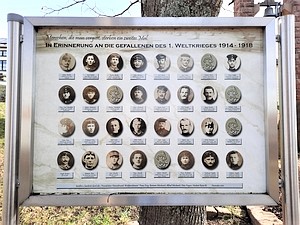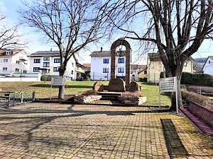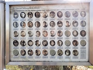 Friedhof: Gepflegte Gedenkanlage unmittelbar bei der Aussegnungshalle und den Gräberfeldern. Die Anlage besteht aus einem mittels Sandsteinen gemauerten großen Torbogen mit Glocke, drei roten Sandsteinfindlingen mit Inschriften und zwei Informationstafeln unter Glas, die Fotos und jeweils wenige Daten zu den Kriegstoten beider Weltkriege beinhalten.