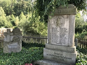 2. Weltkrieg wurde ein grob behauener Felsstein links seitlich hinzugefügt. Ein Grabkreuz ragt aus dem
