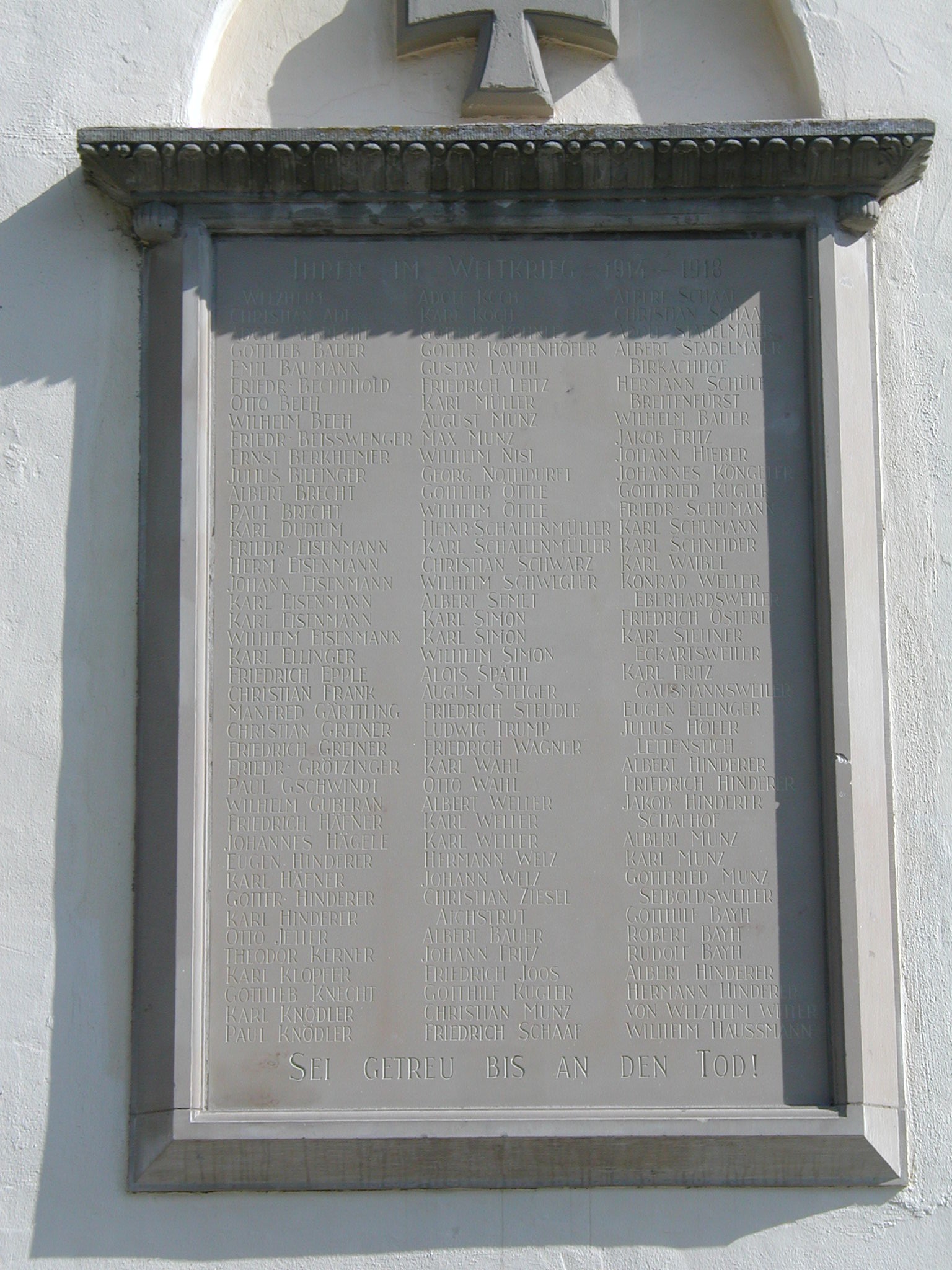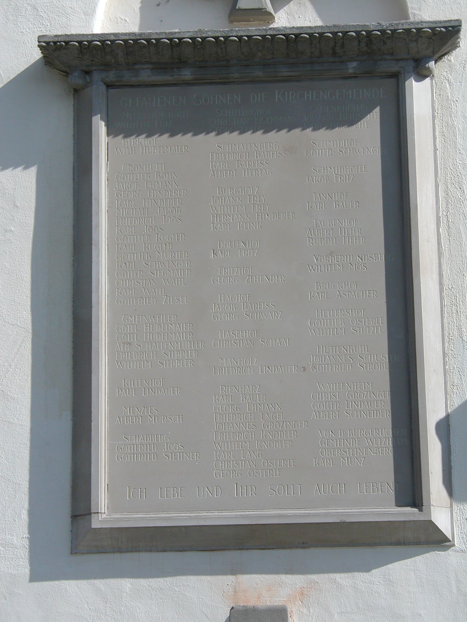 IHREN IM WELTKRIEG 1914 – 1918 GEFALLENEN SÖHNEN DIE KIRCHENGEMEINDE SEI GETREU BIS AN DEN TOD! ICH LEBE UND IHR SOLLT AUCH LEBEN!