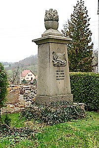 Auf dem Friedhof steht ein 2 Meter hohes Denkmal für den 1. Weltkrieg aus hellen Stein, oben die Skulptur einer Flammschale. Vorne Relief Stahlhelm, EK und Eichenlaub. Zudem fand sich ein Einzelgrab mit Daten zweier Gefallener.