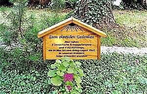 Zum ehrenden Gedenken Hier ruhen 2 sowjetische Kriegsgefangene und 4 KZ-Häftlinge, die in den letzten Kriegstagen 1945 in unseren Wäldern feige ermordet wurden.