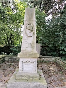 Obelisk (Erhabenes Relief eines Soldatenkopfes mit Stahlhelm, dazu Seitengewehr) 1914 – 1918