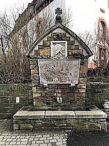 Monument aus Sandsteinblöcken mit spitzzulaufendem Dach, darauf eine Kugel mit Eisernem Kreuz aus Stein. Davor eine Kalksteinplatte mit Widmung und den Namen und Todesdatum der Gefallenen. Darüber ein weiße rechteckige Kalksteinplatte mit Stahlhelm umwunden von Lorbeer. Vor dem Monument ein Brunnen.