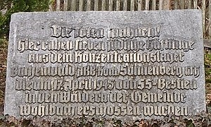 Für auf dem Todesmarsch KZ-Außenlager Sonneberg (Konzentrationslager Buchenwald) - Route durch das Vogtland - am 17. April 1945 - Hermsgrün und Wohlbach: Aufgefundene insgesamt sieben unbekannte Opfer, eines in Hermsgrün, drei am Wohlbacher Dorfteich, eines bei der Braunmühle nahe Bernitzgrün, weitere im Wald zwischen Breitenfeld und Gunzen, wurde nach Kriegsende eine Grabstätte auf dem Friedhof in Wohlbach angelegt. Mindestens einem Häftling gelang die Flucht.