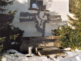 Denkmal auf dem Friedhof an der Südseite der Pfarrkirche St. Moritz: Gedenkplatte mit Namen der Gefallenen und Vermissten, dahinter Steinsockel mit moderner Eisenplastik in Form eines Kreuzes. Die Fotos sind von einer Gedenktafel im Vorzeichen der Kirche entnommen.