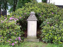 Stele mit krönendem Stahlhelm. Schrift teilweise nicht mehr lesbar.