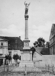 Denkmal für die Gefallenen des Krieges 1870/71 auf dem Viktoriaplatz an der Schlosskirche: Abgestufter und verzierter Quader mit eingelassenen Widmungs- und Namenstafeln. Darüber kleiner Quader mit Portrait-Plakette von Kaiser Wilhelm I. und EK-Zeichen. Darauf eine klassische Säule mit krönender Siegesgöttin, die einen Lorbeerkranz hält (abgerissen).