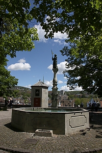 Am Plateau des Lindenhofhügels ein kleiner Park mit Brunnen, am Brunnen keine Inschriften, am sechseckigen Turm dahinter eine Info-Tafel.