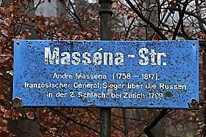 Strassenschild Masséna-Str. Andre Masséna (1758 – 1817) Französischer General, Sieger über die Russen in der 2. Schlacht bei Zürich 1799