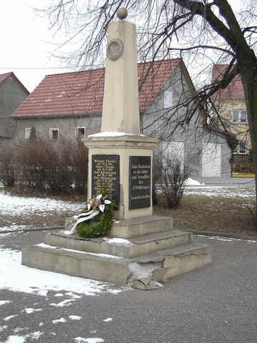 Stele in Ortsmitte; an einer Seite Gedenktafel für die Gefallenen des Ersten Weltkrieges, an anderer namenloser Tafel für die des Zweiten Weltkriegs.