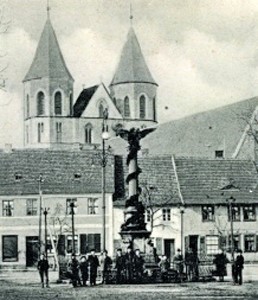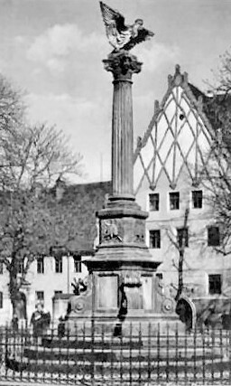 Ehemaliges Denkmal für die Gefallenen des Krieges 1870/71 auf dem Marktplatz: Mehrstufiger Sockel und Quader mit geschwungenen Seitenflügeln an den vier Ecken und eingelassenen Widmungs- und Namenstafeln. Darauf ein Block mit Reliefs von Pickelhauben und eine klassische Säule mit krönendem Adler (nach 1945 abgerissen).