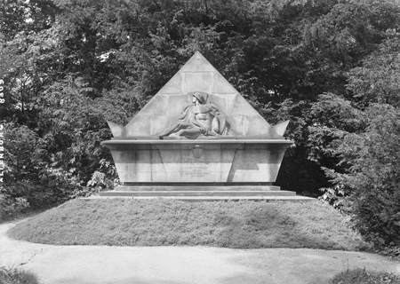 Wand aus Steinblöcken, die sich zur Mitte verbreitert und dann nach oben spitz zuläuft. An der breitesten Stelle war ein Absatz, auf dem das Relief eines sitzenden nackten Kriegers mit Stahlhelm und zerbrochenem Schwert angebracht war. Darunter befand sich die Widmung.