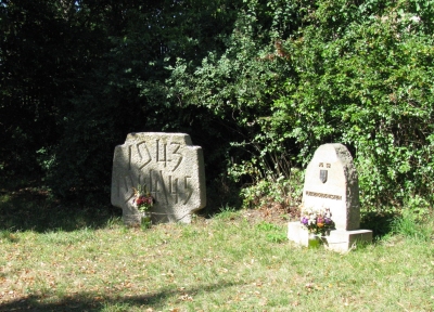 Die Grünfläche begrenzend sind vier Steinkreuze mit eingemeißelten Jahreszahlen aufgestellt.