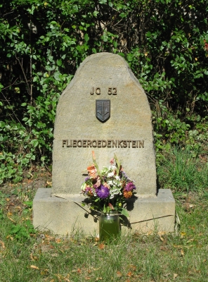 Rechts von den Kreuzen befindet sich ein Gedenkstein für das Jagdgeschwader 52 mit dem Geschwaderwappen.