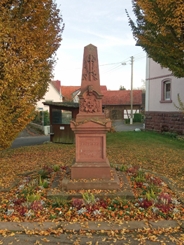 Ein mit Reliefs verzierter Obelisk auf einem Inschriftensockel.