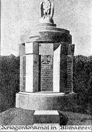 Das Denkmal hat eine ungewöhnliche Form. Ein hoher zylindrischer Granit mit vier Säulen, dazwischen Inschriftenschilder mit den Namen von 53 Kriegsopfern, geordnet nach Todesland. Darüber ein Eisernes Kreuz. Im oberen Kreis ist ein Teil davon ist noch lesbar, nämlich die geschnitzte Widmung. Das gesamte Denkmal wurde von der Skulptur eines auf der Weltkugel sitzenden Adlers gekrönt, der die Schwingen schützend ausbreitet.