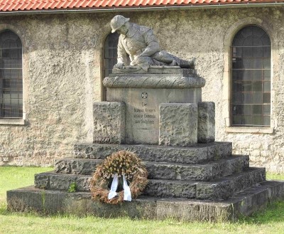 Denkmal für die Gefallenen des Ersten Weltkriegs vor der Kirche: Vierstufiger Sockel mit aufgesetztem Quader, umrandet von Eichenlaub und krönender Figur eines verwundeten Soldaten mit Stahlhelm.