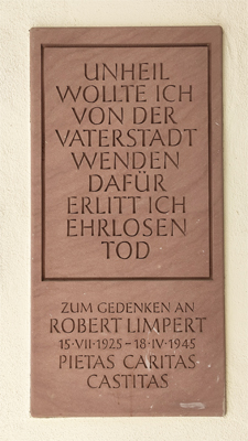 Links davon erinnert eine Tafel an den Studenten Robert Limpert, der in den letzten Kriegstagen mit dem Verteilen von Flugblättern versuchte die kampflose Aufgabe der Stadt zu erreichen. Das Durchtrennen der Telefonleitung eines bereits aufgegebenen Gefechtsstands wurde ihm schließlich zum Verhängnis.