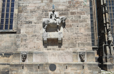 An der Außenwand der Kirche St. Johannis erinnert die Skulptur eines nackten Reiters