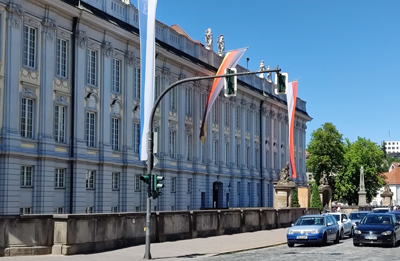Denkmalobelisk neben der Residenz der Markgrafen zu Brandenburg-Ansbach.