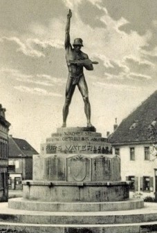 Ehemaliges Denkmal für die Gefallenen des Ersten Weltkriegs: Runder abgestufter Unterbau mit umlaufenden Inschriften und kleinen Widmungs- und Namenstafeln, darauf das Standbild eines nackten Kriegers mit Stahlhelm, eine Hand zum Schwur erhoben. Das Denkmal wurde nach 1945 abgerissen.
