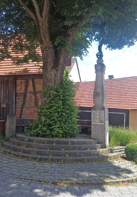 angebaut an eine Sitzbank um die Dorflinde mit einer Inschrift in der Sitzbanklehne.